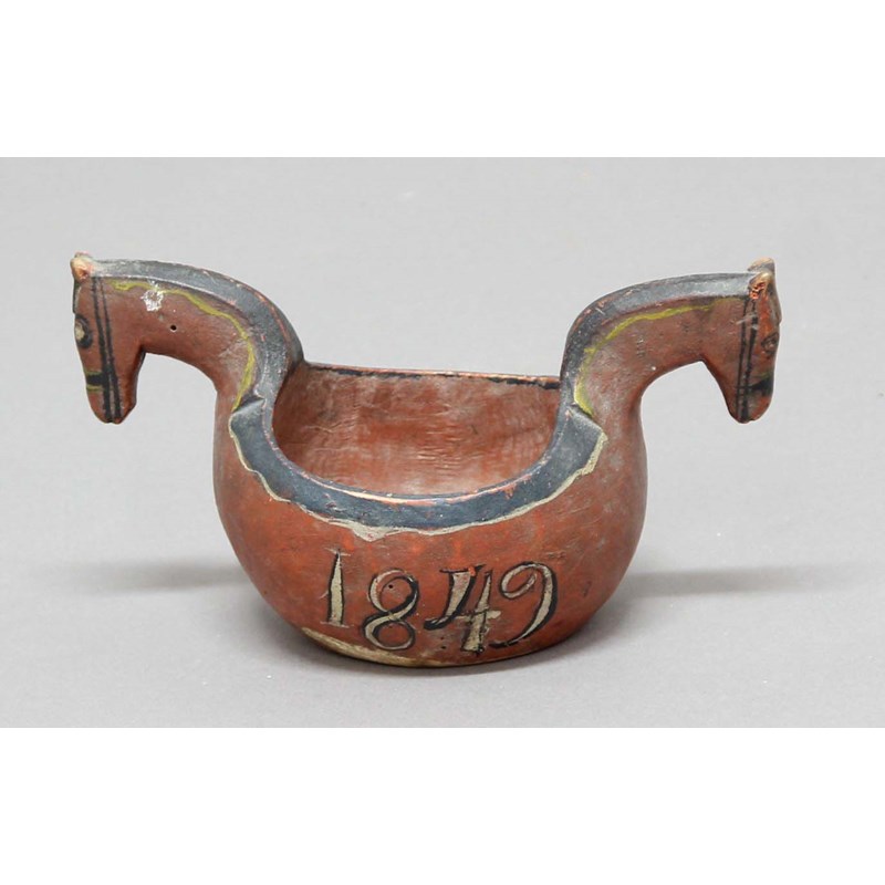 NORWEGIAN KASA, 19th century, carved with horse head handles, painted with initials and the date 1849, length 21cm