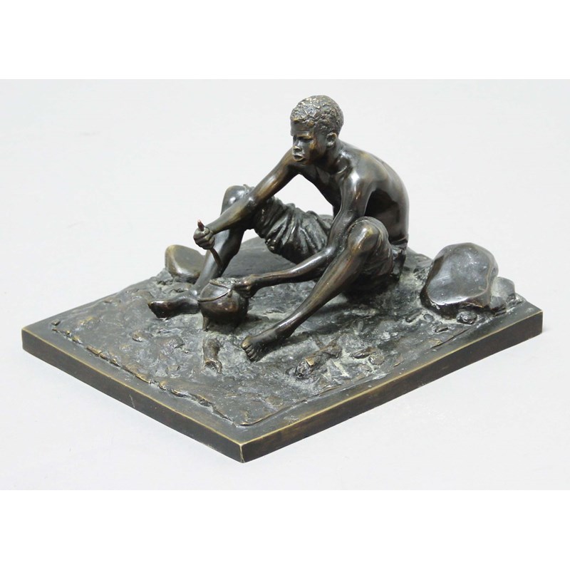 Footnote: The Mealipap Eater depicts a Shangaan Man seated eating mealipap from a traditional three footed pot. This is almost certainly a posthumous casting as it includes an integral bronze base and the figure is holding his stick above the pot rather than using it to scrape the food from the pot.