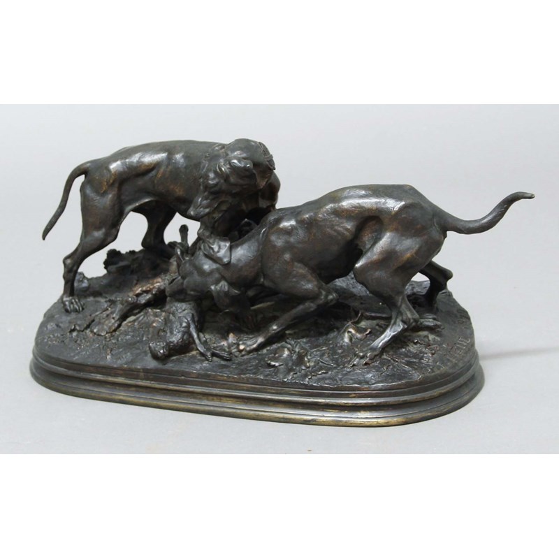 AFTER PJ MENE, Two guns dogs and a hare, signature and date 1872 on an oval base, brown patinated bronze, length 44cm