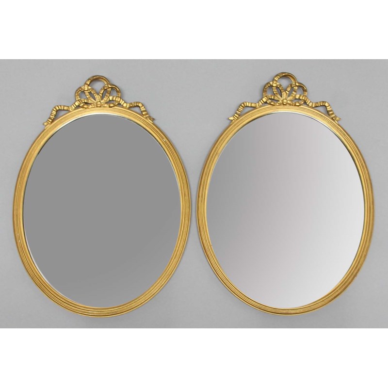 PAIR OF REGENCY STYLE GILT WALL MIRRORS, the bevelled oval plate inside reeded frames and beneath a ribbon crest, height 47cm (2)