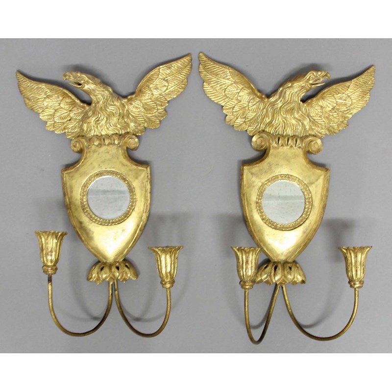 modelled as a spread eagle above a shield with a central mirror and above a pair of candle holders with flower bud sconces, height 53cm, width 35cm (2)