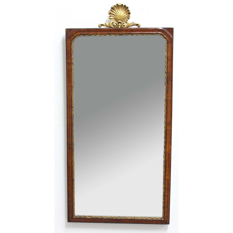 QUEEN ANNE STYLE WALNUT WALL MIRROR, the rectangular plate surmounted by gilt shell crest, height 87cm, width 45.5cm