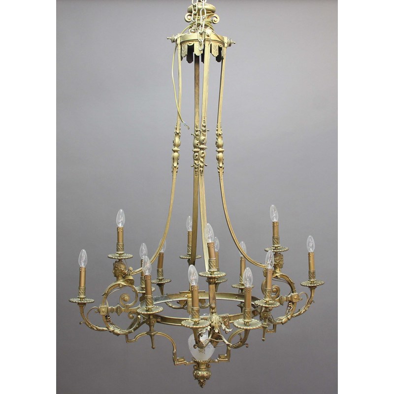 the two tiers of lights on foliate scrolling supports, some with female heads, on a circular frame around a central light, beneath four, slightly splayed supports with scrolling foliate decoration, height including suspension hoop 170cm, width 105cm