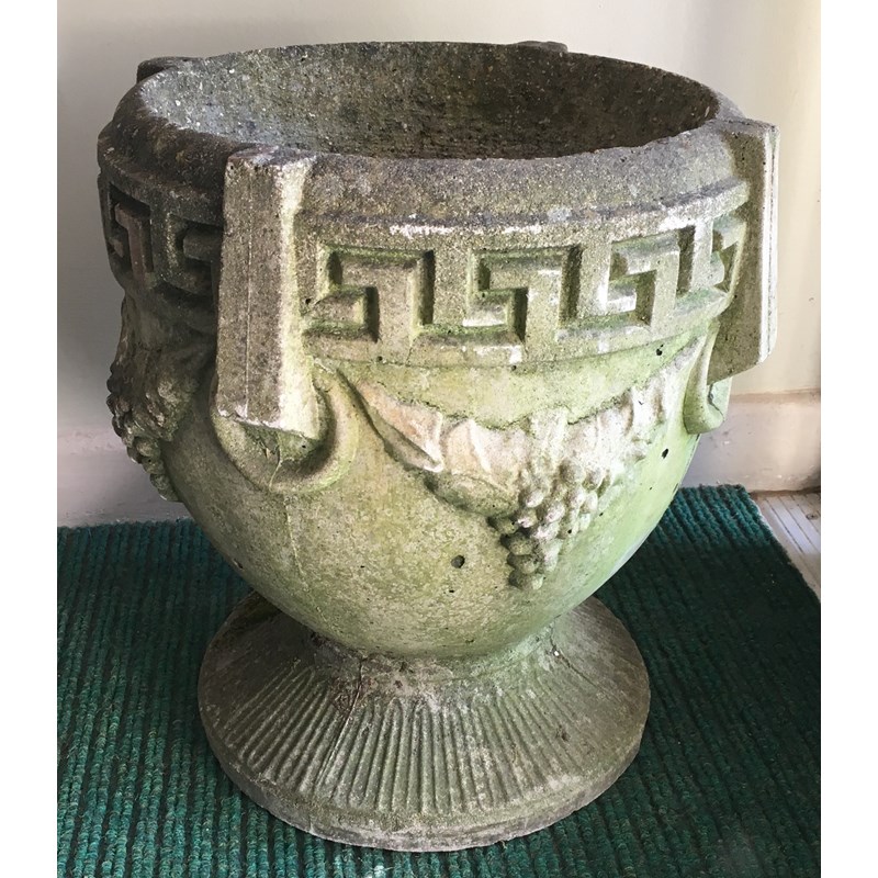 PAIR OF RECONSTITUTED STONE URNS, with Greek key and swag decoration, height 43cm x diameter 39cm (2)