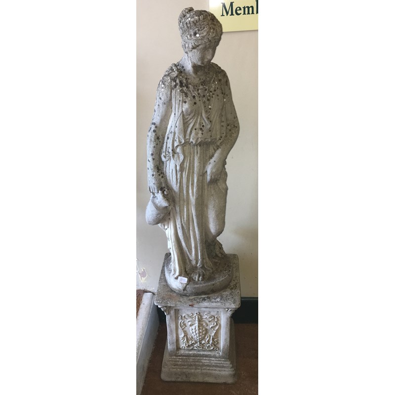 RECONSTITUTED STONE STATUE OF A CLASSICAL MAIDEN, raised on a pedestal, total height 140cm