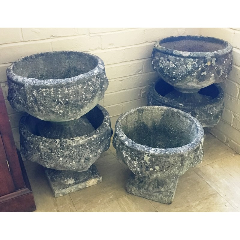 SET OF FIVE RECONSTITUTED STONE URNS, with swag decoration, height 33cm x diameter 38cm (5)