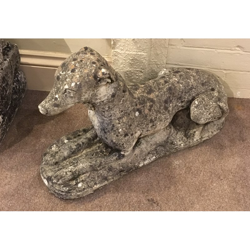 PAIR RECONSTITUTED STONE RECUMBENT WHIPPETS, height 37cm x length 66cm x depth 22cm (2)