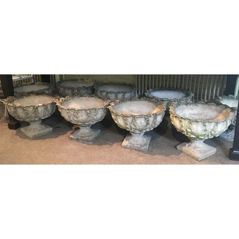SET OF NINE RECONSTITUTED STONE PLANTERS, of acanthus leaf form, height 36cm x diameter 49cm (9)