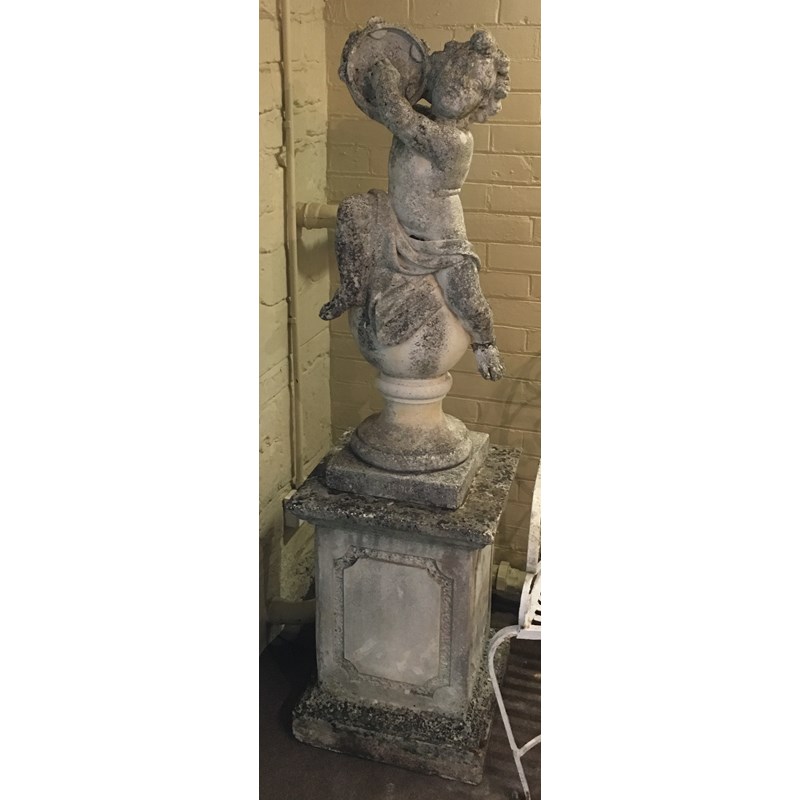 LARGE RECONSTITUTED MARBLE FIGURE, of a cherub musician, raised on a pedestal, total height 160cm