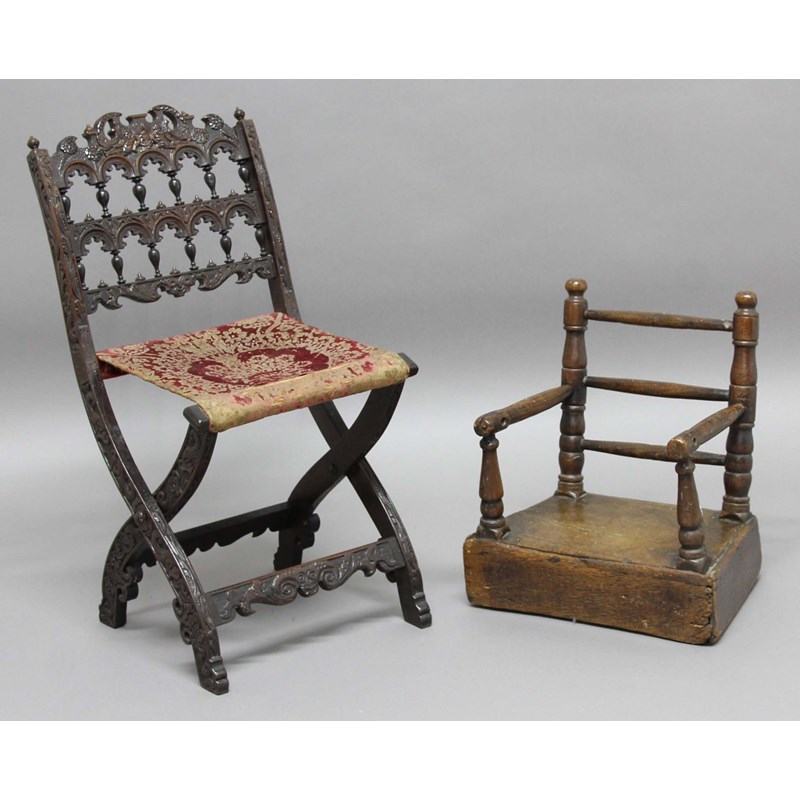 perhaps early 18th century, the turned back and arms on a 'box' seat, probably adapted from a high or correction chair, height 46cm; together with a carved oak child's folding chair (2)