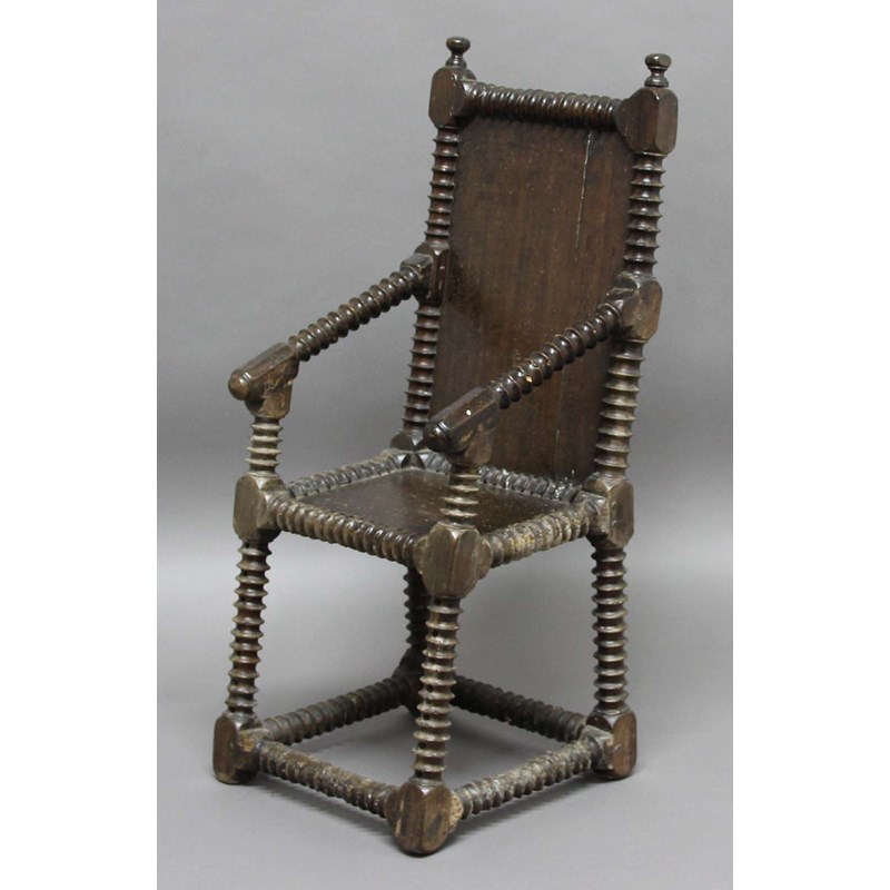 CHILD'S OAK ARM CHAIR, possibly late 17th century, the bobbin turned frame with boarded back and seat, height 86cm