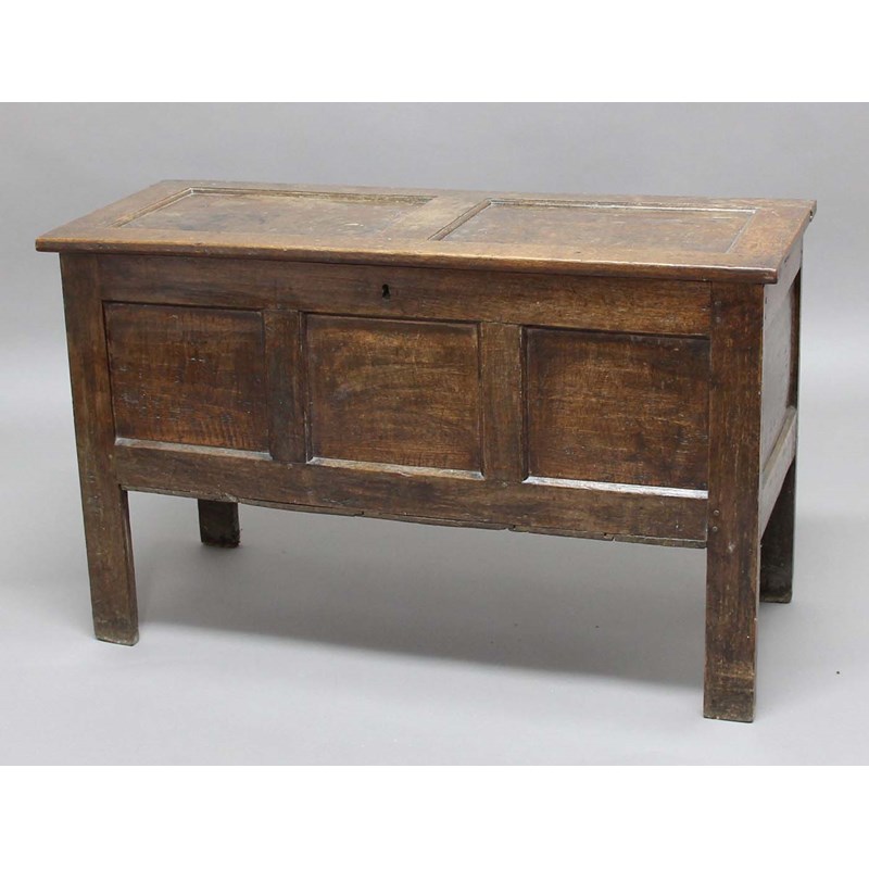 OAK COFFER, late 17th or early 18th century, the twin panelled cover over a triple panelled front, height 68cm, width 45cm, depth 110cm