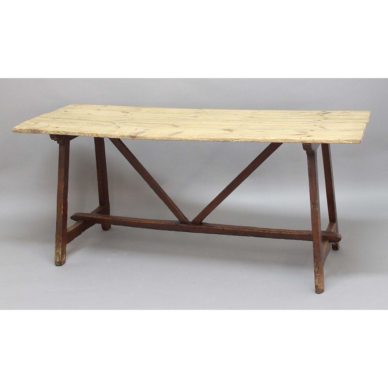 PINE TAVERN TABLE, 19th century, the four plank top on a stained trestle style base, height 79cm, width 179cm, depth 67cm
