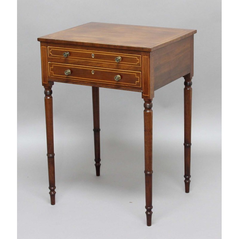 the rectangular top above a drawer fitted with a writing slope and pen rests and a further vacant drawer, the whole with boxwood string inlay, height 75cm, width 53cm, depth 44cm