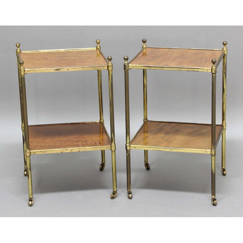 PAIR OF MAHOGANY AND BRASS TWO TIER TABLES, of square section, height 58cm, width 35cm, depth 35cm (2)