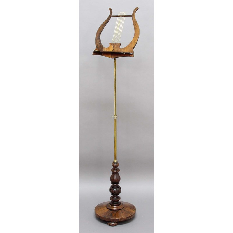 VICTORIAN ROSEWOOD AND BRASS MUSIC STAND, the lyre shaped rest on a telescopic column, turned base and circular foot, minimum height 117cm