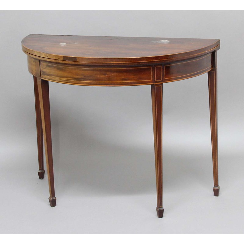 GEORGE III MAHOGANY DEMI-LUNE CARD TABLE, with a cross banded top and box wood line inlay, height 76cm, width 96cm