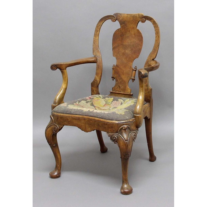 GEORGE I STYLE WALNUT OPEN ARMCHAIR, the back with inverted baluster splat, outswept arms, drop in seat and cabriole front legs, height 99cm