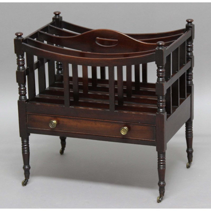 GEORGE III MAHOGANY CANTERBURY, the four divisions with a central handle above a single drawer, height 52cm, width 50cm, depth 34cm