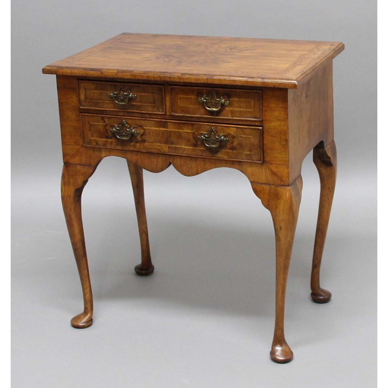 the butterfly veneered and feather banded top above two short and one long drawer, serpentine apron and cabriole legs with pad feet, height 75cm, width 67cm, depth 45cm