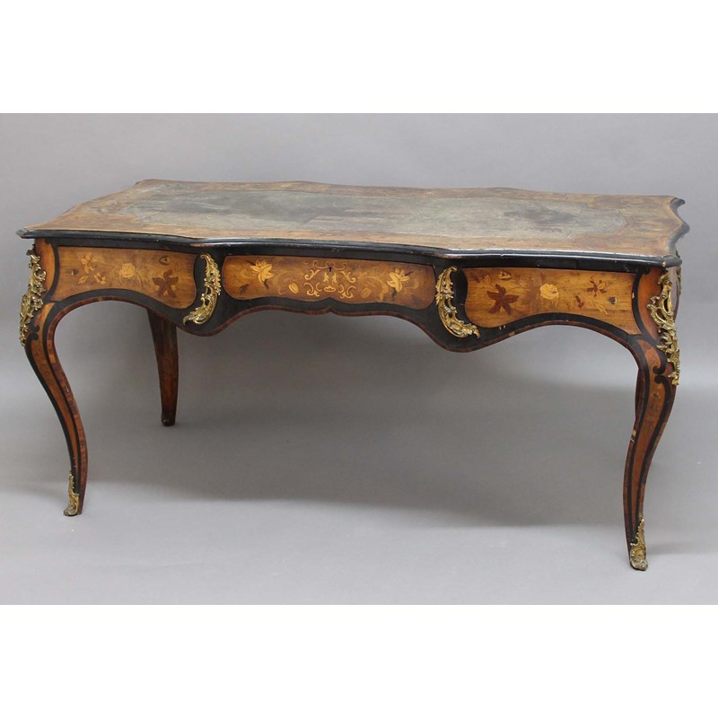 the serpentine top with leather insert inside a broad floral inlaid border above an inlaid frieze with three drawers on cabriole legs, the whole with ormolu, foliate mounts, height 79cm, width 163cm, depth 90cm