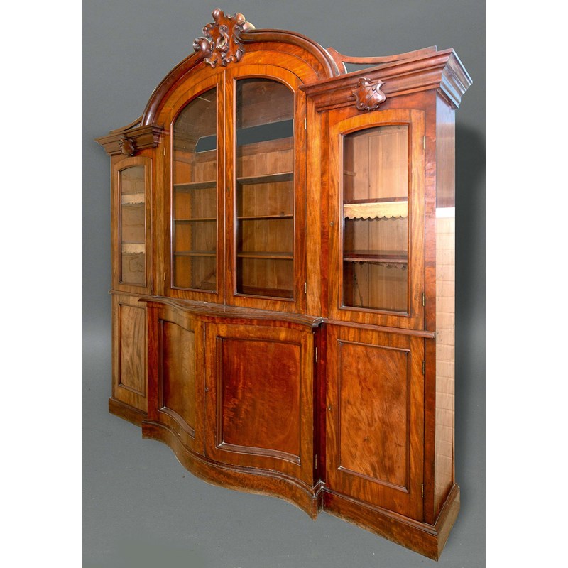 the foliate crest above a pair of arched, glazed doors, flanked by two further glazed doors, the base with a central, serpentine pair of panelled cupboards flanked by a further pair of cupboards, height 255cm, width 210cm, depth 45cm