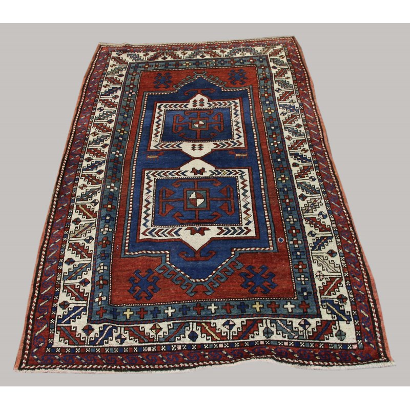 Central Caucasus, circa 1910, the madder field with central double niche panel containing twin hooked devices enclosed by ivory borders of stepped leaves flanked by barber poles and guard stripes, 202cm x 120cm approx