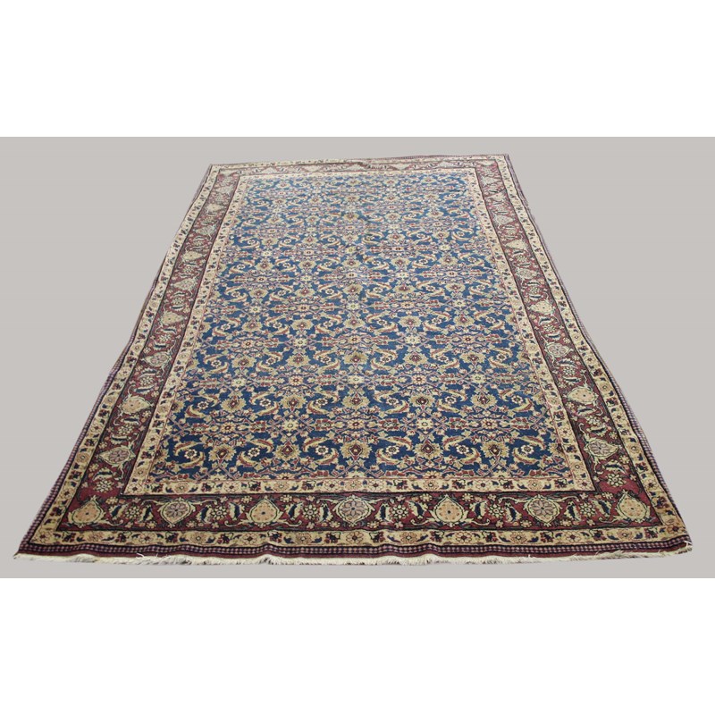 probably Veramin, circa 1940, the mid indigo field with an all over Herati design enclosed by aubergine borders of samovar motifs flanked by ivory floral vine guard stripes and arrow head outer guard stripes, 325 x 191cm