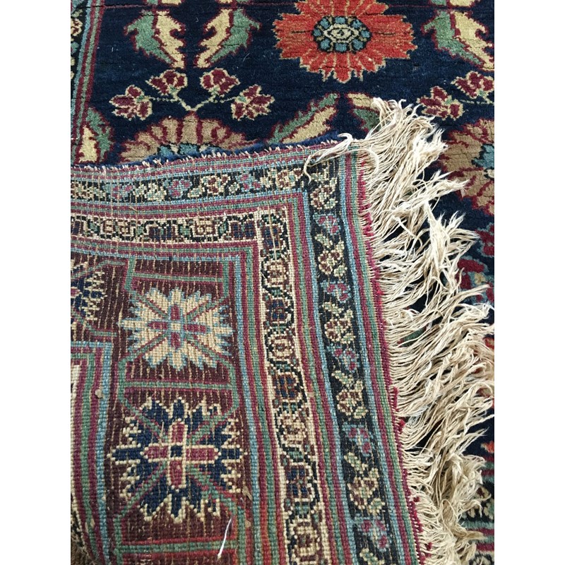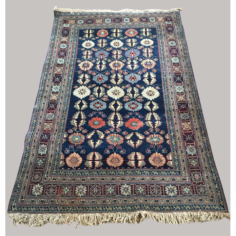 late 19th century, probably Agra North India, the indigo field with columns of polychrome flower heads enclosed by narrow Harshang aubergine borders flanked by multiple guard stripes, 200cm x 135cm