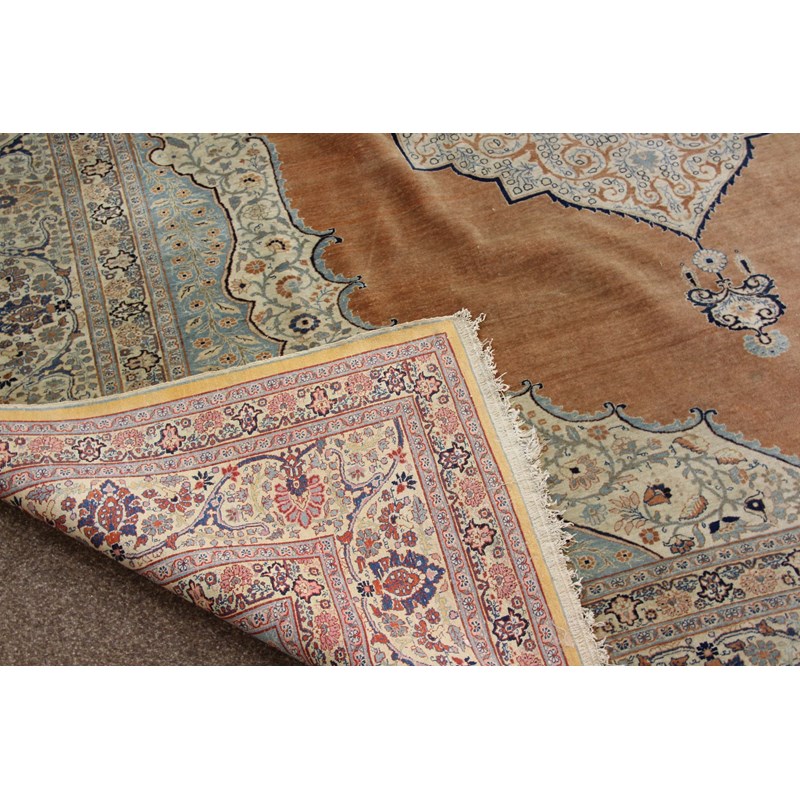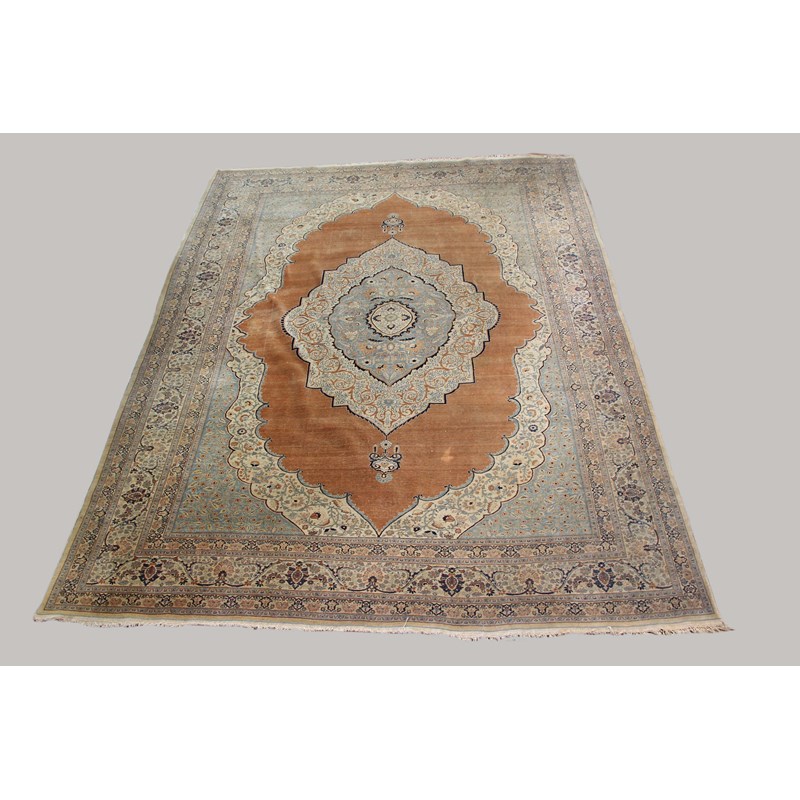 Marand, Iranian Azerbaijan, late 19th century, the plain soft madder field centred by an ivory and ice blue cusped and stepped medallion of scrolling vines and flowers enclosed by similar spandrels and ivory meandering vine borders flanked by multiple guard stripes, 380 x 290cm