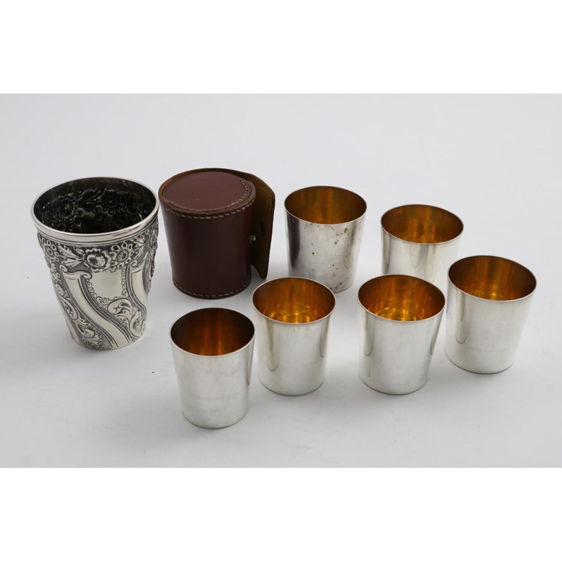 with embossed floral and swirl-fluted decoration, vacant cartouche, by Mappin & Webb, Sheffield 1900 and a nest of six plated picnic beakers with gilt interiors, by the Goldsmiths & Silversmiths Co. (fitted leather case), the former 3.8" (9.7 cms) high; 4.35 oz weighable silver (2)