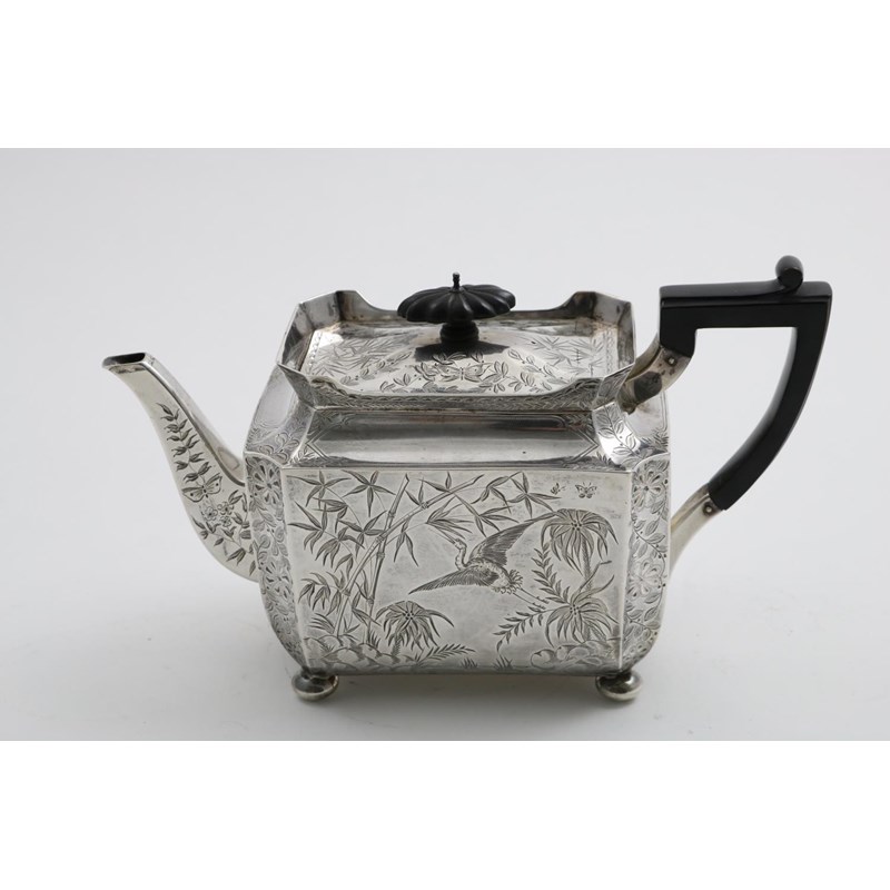 with panelled sides, button feet and incurved corners, engraved all over in the Japanese taste with cranes & butterflies flying over swamps and amongst foliage, by W & J. Barnard, London 1886; 5.75" (4.5 cms) high; 18.9 oz