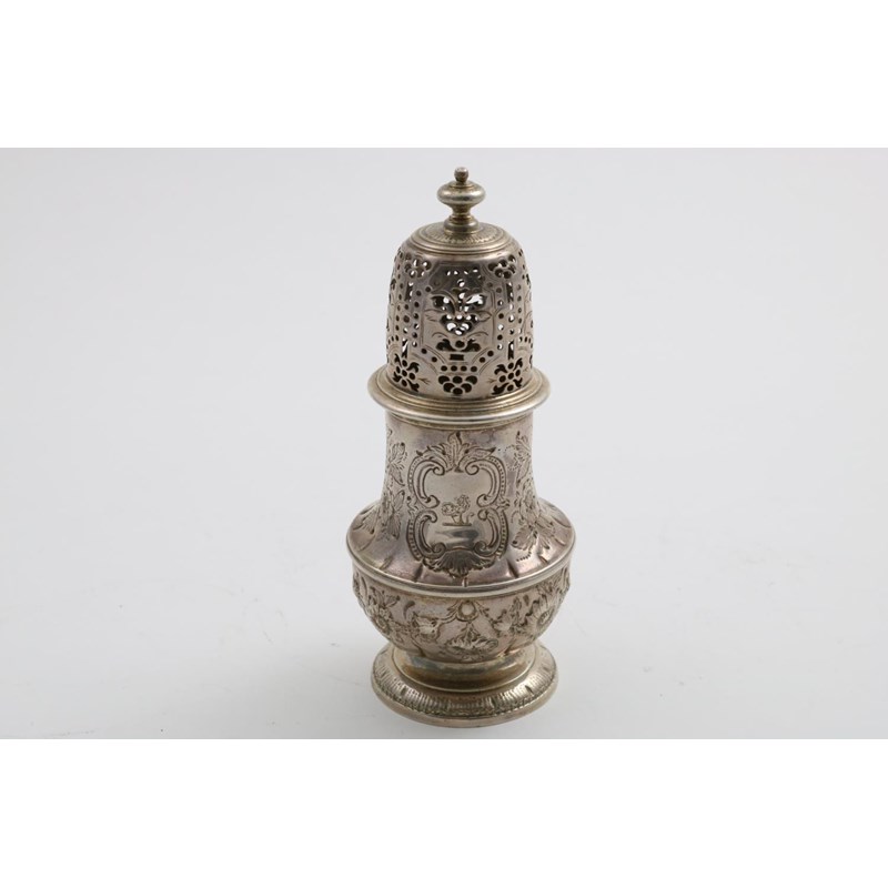 of vase form with a high-domed cover and knop finial, the body with chased and embossed floral decoration, crested, initialled "S" over "I.L" under the foot, maker's mark only (struck 6 times) & lion passant (once), by Thomas Bamford, London c.1725; 6.95" (17.5 cms) high; 8.75 oz