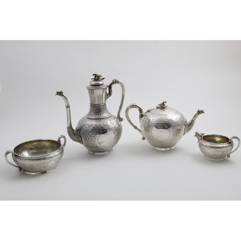 Middle Eastern in style with chased formal decoration and spherical bodies, each piece with a vacant circular cartouche on each side, the milk jug, teapot and coffee pot with animal mask spouts and the pots with dragon finials, by Frederick Elkington, London 1871 (with Registered Design lozenge); the coffee pot 9.75" (25 cms) high; 62.25 oz (4)