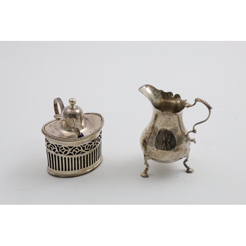 with a high-domed cover & blue glass liner, by T. Bradbury, London 1905, (with matching spoon) and an early George III small baluster cream jug, initialled "LRM" underneath, by Walter Brind, London 1765; the latter 4" (10 cms) high; 6.5 oz weighable silver (2)