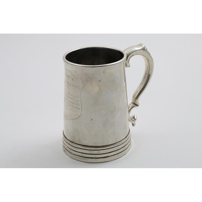 of tapering form with a reeded foot, a scroll handle and inset glass base, the front engraved with a presentation inscription with a shield outline "Presented to Herbert H,. Jollye RN...Hong Kong, 1st Februrary 1866", by Leeching, with character mark also; 5" (13 cms) high