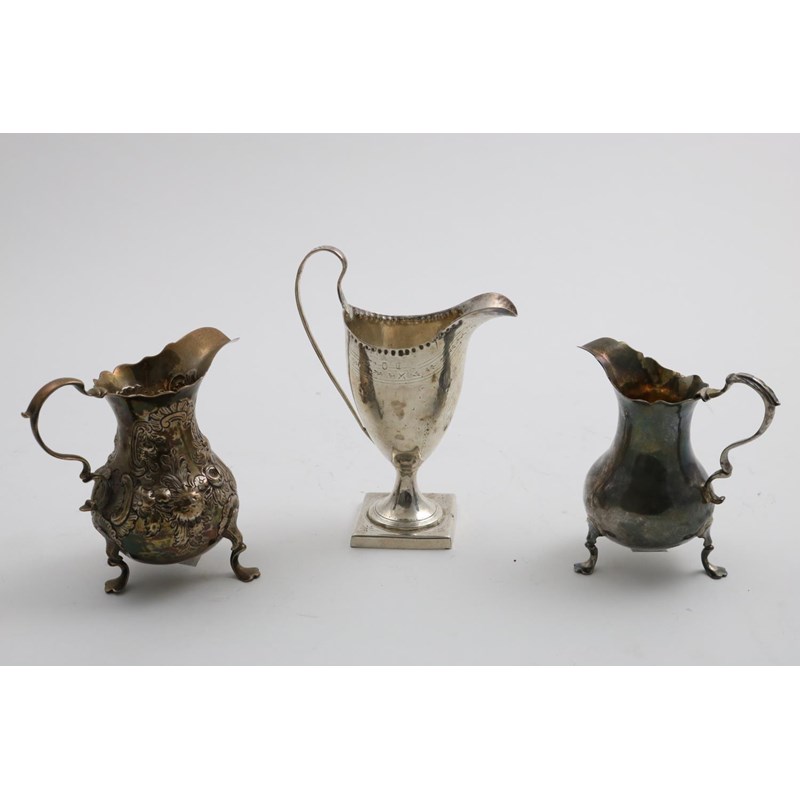 on three legs with repousse-work, floral scroll decoration & a vacant cartouche, maker's mark unclear, London 1755, another plain example by David Mowdem, London 1769 and a George III engraved cream jug on a square pedestal foot, London 1788; the latter 5.5" (14 cms) high; 8 oz (3)