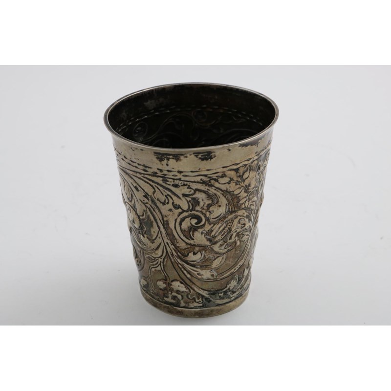 of tapering form with embossed scrolling foliage and flowers around the sides, initialled "HTS" and "CJD" around the rim and the base inscribed as a prize "26th Middlesex Rifle Volunteers Company Drill Challenge Cup 1871", maker's mark "HB conjoined, town mark "F" in a shield, unascribed, c.1700; 4.5" (11.5 cms) high; 3.55 oz