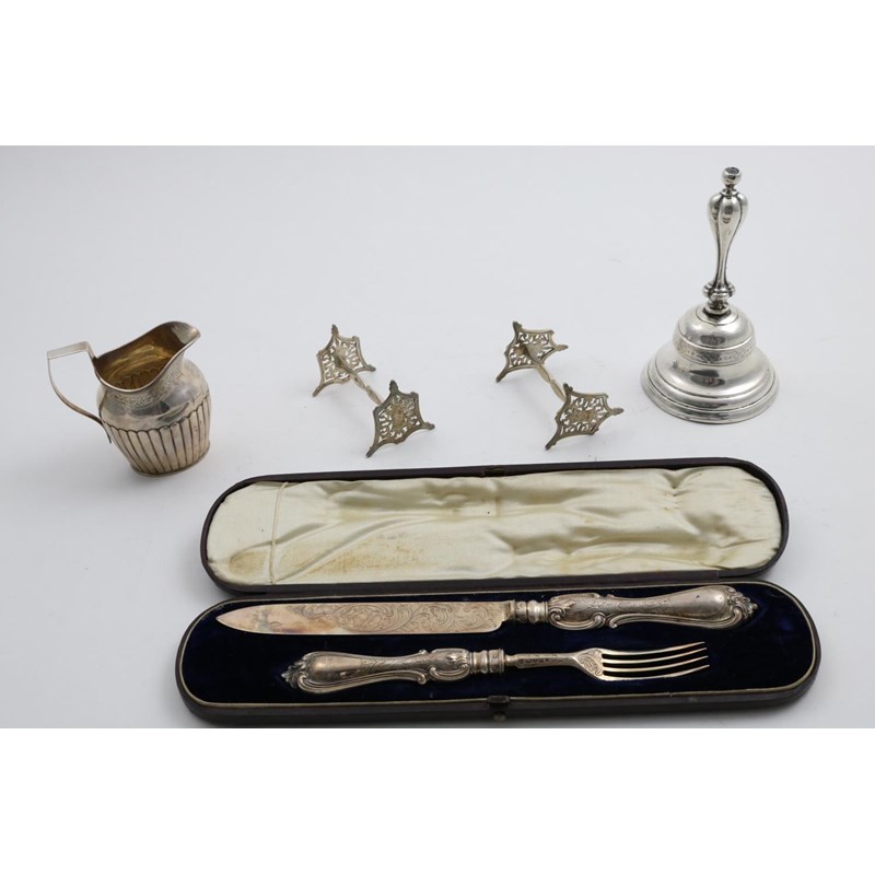 A pair of Victorian knife rests, a Victorian milk jug, crested and initialled "R", a plated hand-bell and a Victorian dessert serving knife and fork, in a fitted case; the jug 3.75" 9.5 cms) high; 5.5 oz weighable silver (5)