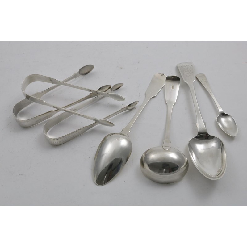 two table spoons, three pairs of sugar tongs, a sauce ladle and a tea spoon, all with either initials, dedications or a crest;  9.8 oz  (7)