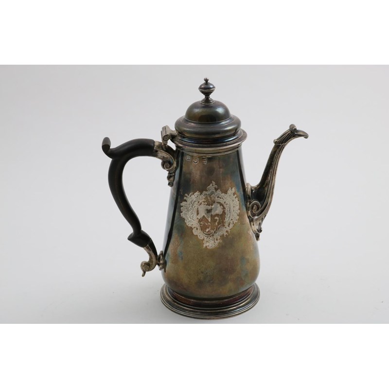with a tapering body, tucked-in base and spreading foot, the domed cover with a cup and cover finial, engraved on each side of the body with a rocaille cartouche and underneath with the scratchweight "22-17", no maker's mark, London 1747; 9.25" (23.5 cms) high; 23.6 oz
