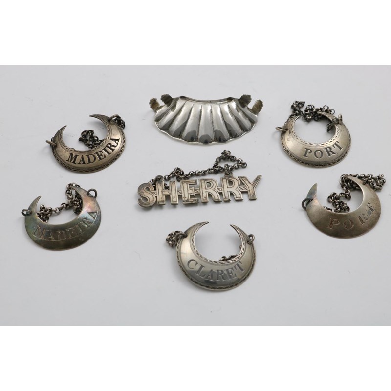 with bright-cut borders; "PORT", "MADEIRA" & "CLARET" by Hester Bateman, London 1785-90 (maker's mark and lion passant only), two other George III crescent wine labels, a plated "SHERRY" label and a plated clip-on moustache guard for a glass or cup; the latter 2.6" (6.5 cms) wide; 1.3 oz weighable silver (7)