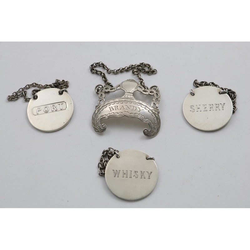 two by Grey & Co. and one by S. Mordan & Co. Chester 1935 and 1910 and a George III "BRANDY" label with an urn & ribbon surmount, maker's mark of Thomas Arnold, overstriking that of Hester Bateman, London c.1775; the latter 1.75" (4.5 cms) long; 2.1 oz (4)