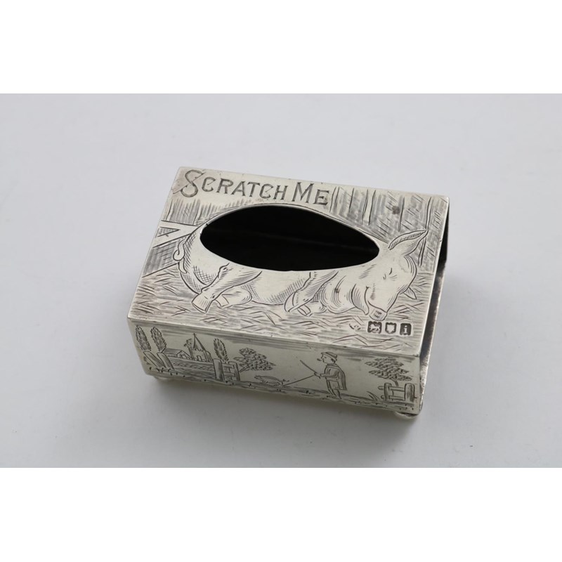 engraved with a lady & a gentleman, each taking a pig to market and a slumbering pig on the cover with a cut-out and the words "SCRATCH ME", by A. Barrett & Sons, London 1904; 3" (7.5 cms) long; 2 oz