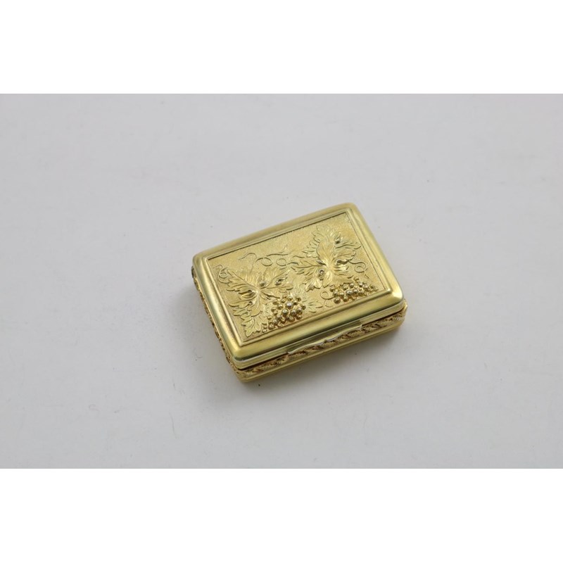 with a row of shells around the sides and vine leaves with grapes in low relief on the cover, by Samuel Pemberton, Birmingham 1816 (original morocco leather case); 2" (5 cms) long; 1.5 oz