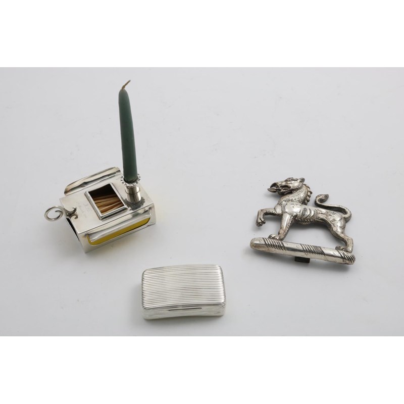 An early 19th century caparison in the form of a heraldic beast crest (loaded), a late Victorian match-box mount/taper holder, initialled and dated "1901" and a George III reeded snuff box with a presentation inscription inside, by Alice & George Burrows, London 1807; the latter 2.75" (7 cms) long; 3.95 oz weighable silver (3)