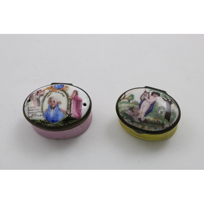 A late 18th century enamelled copper patch box, oval with the portrait of Admiral Nelson on the cover, to commemorate the "Victory of the Nile, August 1798" and another enamelled copper patch box; the former 2" (5 cms) long (2)