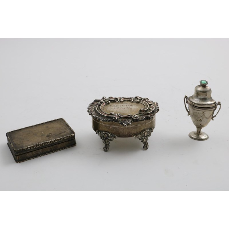 with embossed decoration, inscribed "MALLYDAMS SHOOT 21ST NOV. 1908", by Walker & Hall, Sheffield 1905, a Victorian engine-turned snuff box and an early 19th century Scandinavian hovedvansaeg; the latter 3.45" (8.8 cms) high; 9.25 oz