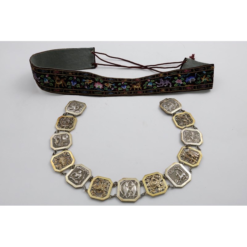 made up of linked octagonal panels, chased with birds, fish animals, figures and a dragon (some panels pierced), c.1900, and an embroidered bead work sash; the belt 26.5" (67.5 cms) long; 4.35 oz weighable silver (2)