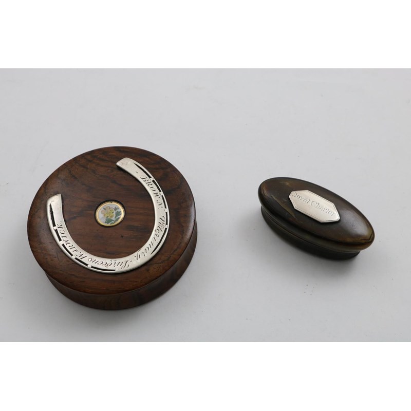 of navette outline with a cartouche on the cover, inscribed "ROYAL CHARTER" and a late Victorian turned hardwood snuff box with an applied horseshoe on the cover, inscribed "BROWN Veterinary Surgeon, WARWICK" and a verre-eglomise boss in the centre; the horn box 2.3" (6 cms) long (2)
